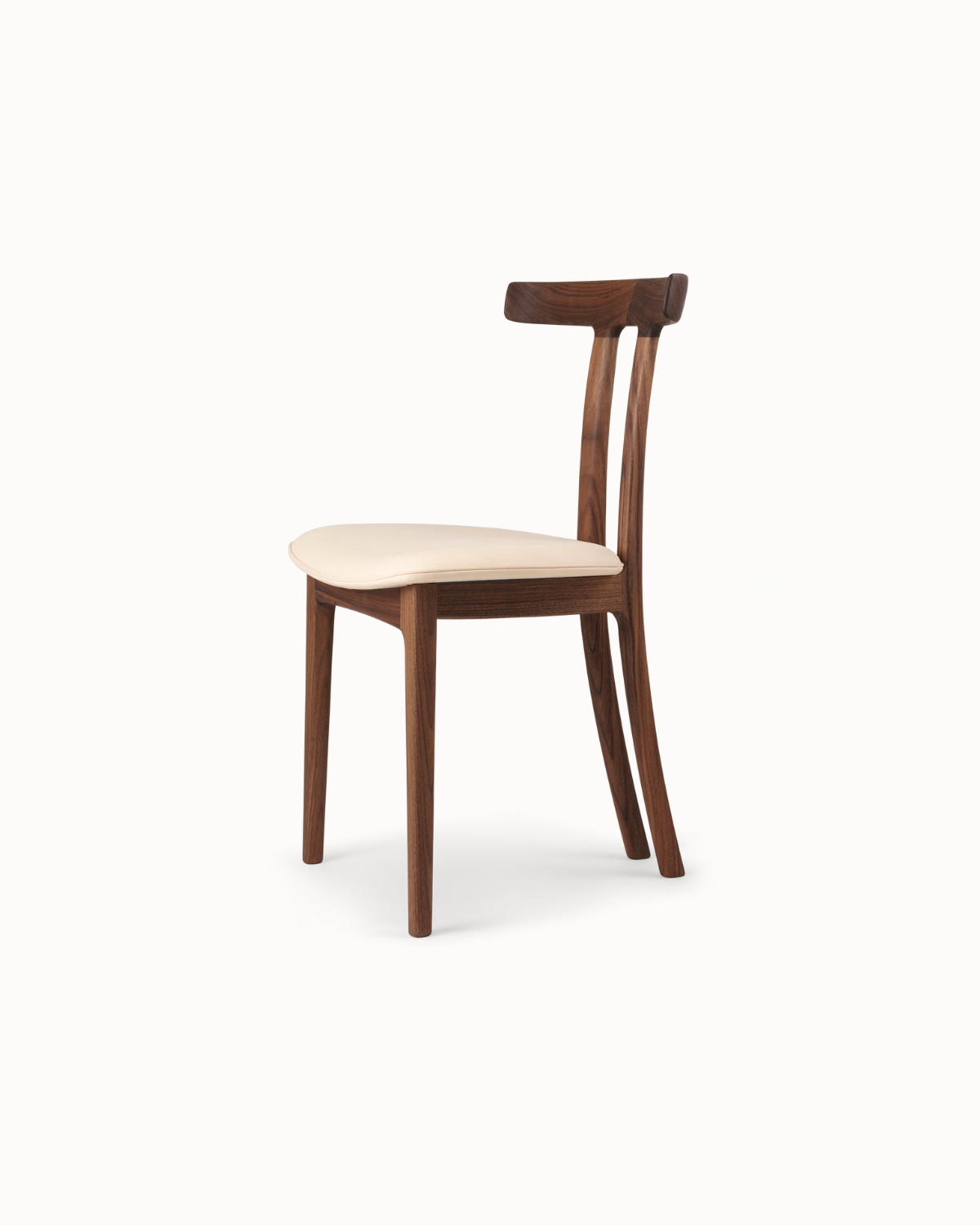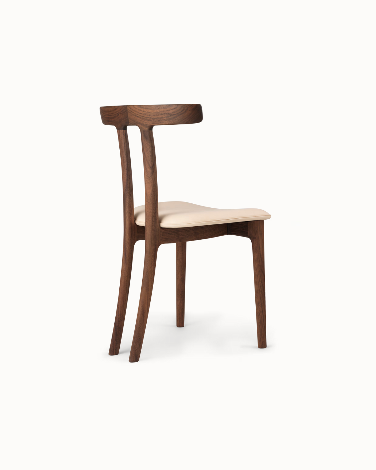 The Tribhā wooden dining chair celebrates balance, unity, and elegant form. Its unique T-shaped backrest creates a striking silhouette inspired by a three-legged tripod.